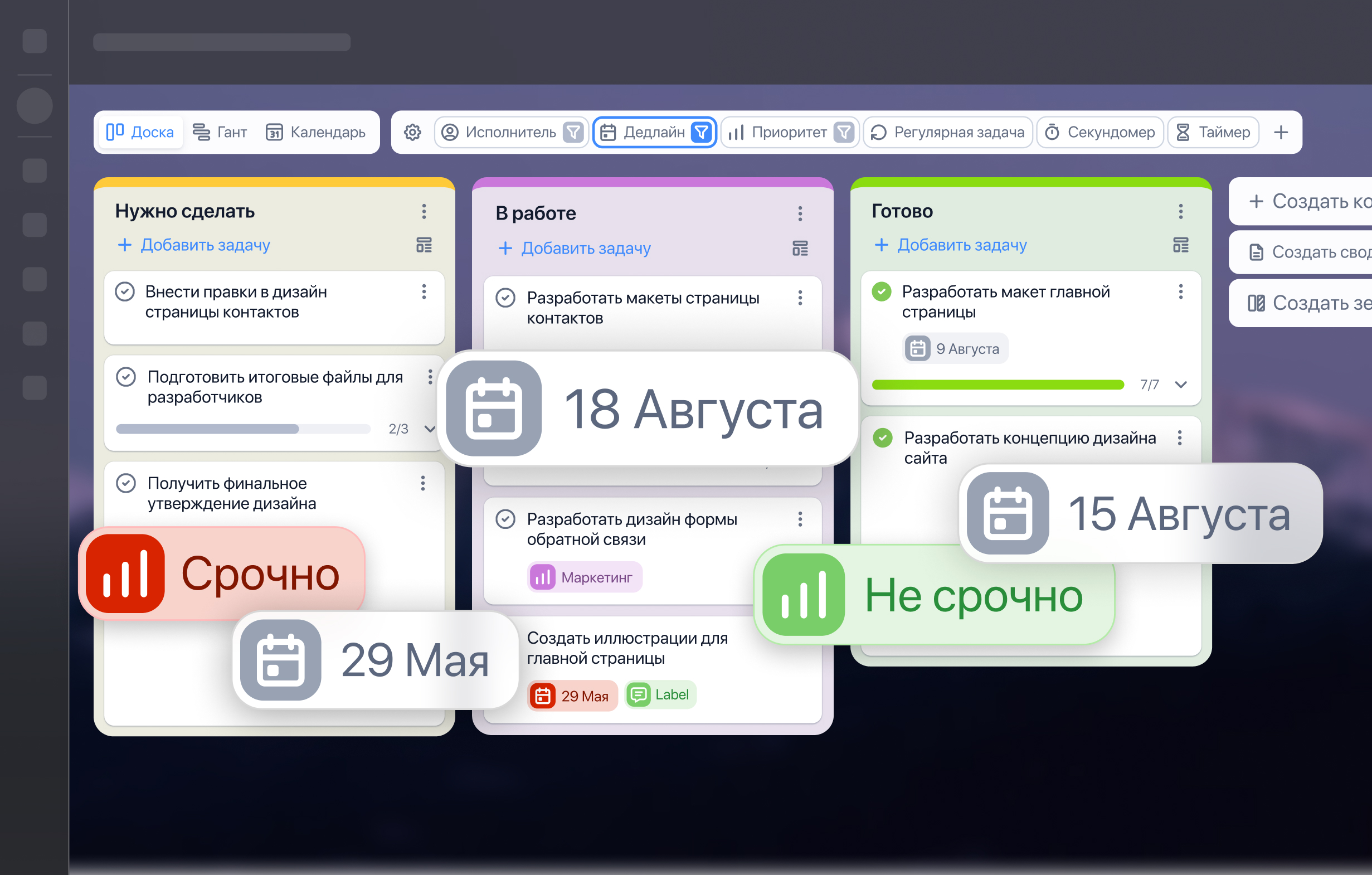 А если в чате обсуждение уходит в сторону, из сообщения в мессенджере можно создать новую задачу и перенести её на нужную доску.